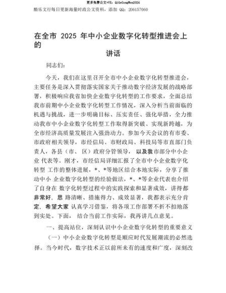 【七哥公文】2025年:【七哥公文】在全市2025年中小企业数字化转型推进会上的讲话+更多免费公文+VX:QiGeGongWen2024+更多免费公文+VX:QiGeGongWen2024