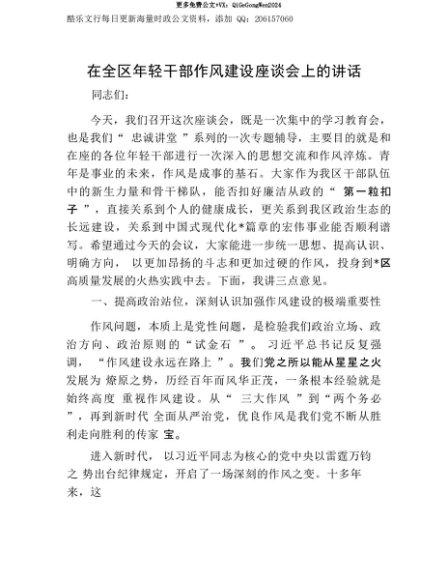 【七哥公文】2025年:【七哥公文】在全区年轻干部作风建设座谈会上的讲话+更多免费公文+VX:QiGeGongWen2024+更多免费公文+VX:QiGeGongWen2024