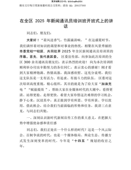 【七哥公文】2025年:【七哥公文】在全区2025年新闻通讯员培训班开班式上的讲话+更多免费公文+VX:QiGeGongWen2024+更多免费公文+VX:QiGeGongWen2024