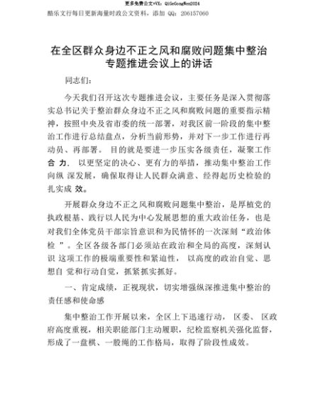 【七哥公文】2025年:【七哥公文】在全区群众身边不正之风和腐败问题集中整治专题推进会议上的讲话+更多免费公文+VX:QiGeGongWen2024+更多免费公文+VX:QiGeGongWen2024
