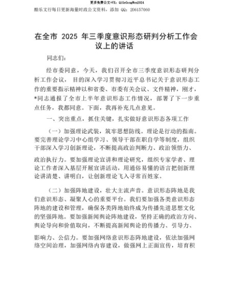 【七哥公文】2025年:【七哥公文】在全市2025年三季度意识形态研判分析工作会议上的讲话+更多免费公文+VX:QiGeGongWen2024+更多免费公文+VX:QiGeGongWen2024
