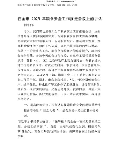 【七哥公文】2025年:【七哥公文】在全市2025年粮食安全工作推进会议上的讲话+更多免费公文+VX:QiGeGongWen2024+更多免费公文+VX:QiGeGongWen2024