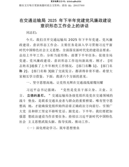【七哥公文】2025年:【七哥公文】在交通运输局2025年下半年X建X风廉政建设意识形态工作会上的讲话+更多免费公文+VX:QiGeGongWen2024+更多免费公文+VX:QiGeGongWen2024