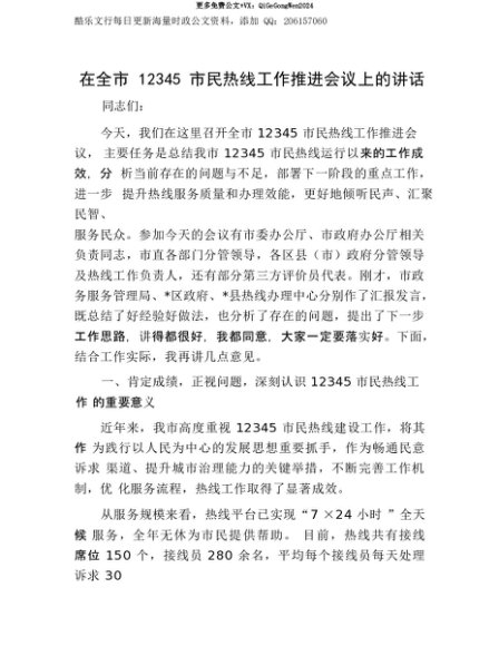 【七哥公文】2025年:【七哥公文】在全市12345市民热线工作推进会议上的讲话+更多免费公文+VX:QiGeGongWen2024+更多免费公文+VX:QiGeGongWen2024
