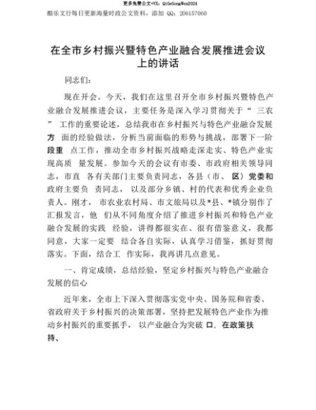 【七哥公文】2025年:【七哥公文】在全市乡村振兴暨特色产业融合发展推进会议上的讲话+更多免费公文+VX:QiGeGongWen2024+更多免费公文+VX:QiGeGongWen2024