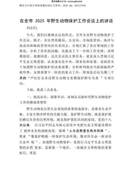 【七哥公文】2025年:【七哥公文】在全市2025年野生动物保护工作会议上的讲话+更多免费公文+VX:QiGeGongWen2024+更多免费公文+VX:QiGeGongWen2024