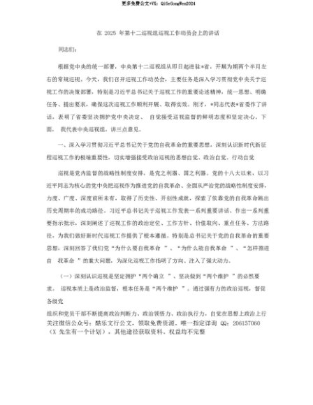 【七哥公文】2025年:【七哥公文】在2025年第十二巡视组巡视工作动员会上的讲话+更多免费公文+VX:QiGeGongWen2024+更多免费公文+VX:QiGeGongWen2024