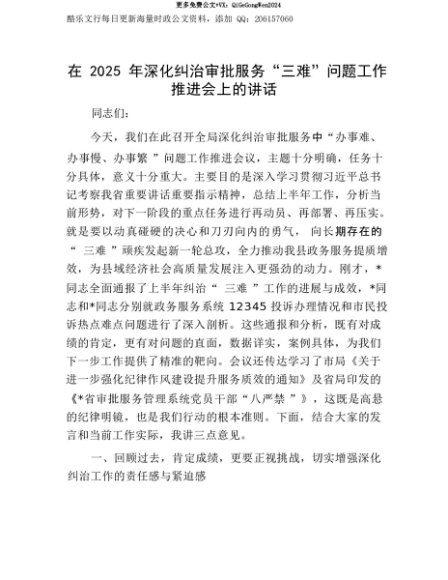 【七哥公文】2025年:【七哥公文】在2025年深化纠治审批服务“三难”问题工作推进会上的讲话+更多免费公文+VX:QiGeGongWen2024+更多免费公文+VX:QiGeGongWen2024