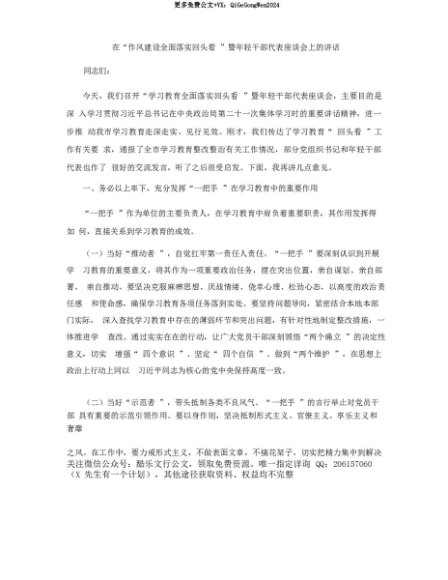 【七哥公文】2025年:【七哥公文】在“作风建设全面落实回头看”暨年轻干部代表座谈会上的讲话+更多免费公文+VX:QiGeGongWen2024+更多免费公文+VX:QiGeGongWen2024
