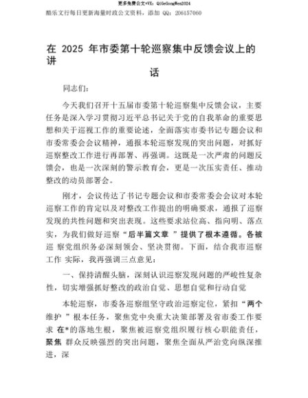 【七哥公文】2025年:【七哥公文】在2025年市委第十轮巡察集中反馈会议上的讲话+更多免费公文+VX:QiGeGongWen2024+更多免费公文+VX:QiGeGongWen2024