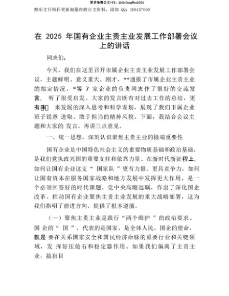 【七哥公文】2025年:【七哥公文】在2025年国有企业主责主业发展工作部署会议上的讲话+更多免费公文+VX:QiGeGongWen2024+更多免费公文+VX:QiGeGongWen2024