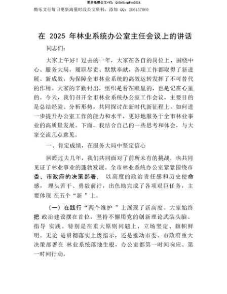 【七哥公文】2025年:【七哥公文】在2025年林业系统办公室主任会议上的讲话+更多免费公文+VX:QiGeGongWen2024+更多免费公文+VX:QiGeGongWen2024