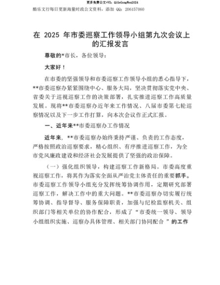 【七哥公文】2025年:【七哥公文】在2025年市委巡察工作领导小组第九次会议上的汇报发言+更多免费公文+VX:QiGeGongWen2024+更多免费公文+VX:QiGeGongWen2024