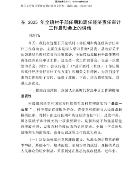【七哥公文】2025年:【七哥公文】在2025年全镇村干部任期和离任经济责任审计工作启动会上的讲话+更多免费公文+VX:QiGeGongWen2024+更多免费公文+VX:QiGeGongWen2024