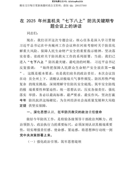 【七哥公文】2025年:【七哥公文】在2025年州直机关“七下八上”防汛关键期专题会议上的讲话+更多免费公文+VX:QiGeGongWen2024+更多免费公文+VX:QiGeGongWen2024