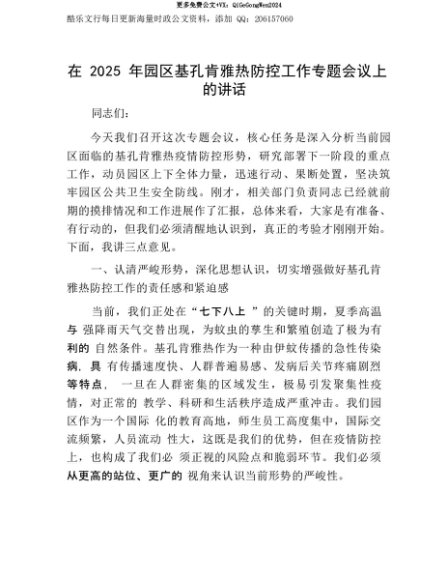 【七哥公文】2025年:【七哥公文】在2025年园区基孔肯雅热防控工作专题会议上的讲话+更多免费公文+VX:QiGeGongWen2024+更多免费公文+VX:QiGeGongWen2024