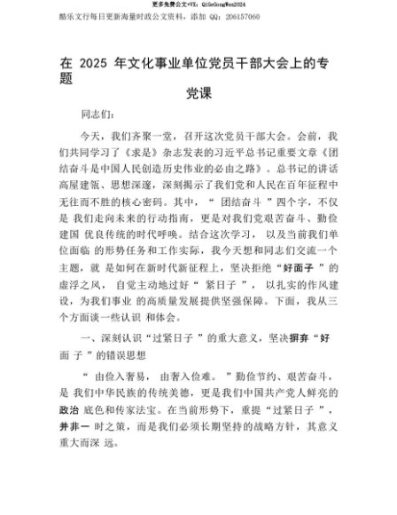 【七哥公文】2025年:【七哥公文】在2025年文化事业单位X员干部大会上的专题X课+更多免费公文+VX:QiGeGongWen2024+更多免费公文+VX:QiGeGongWen2024