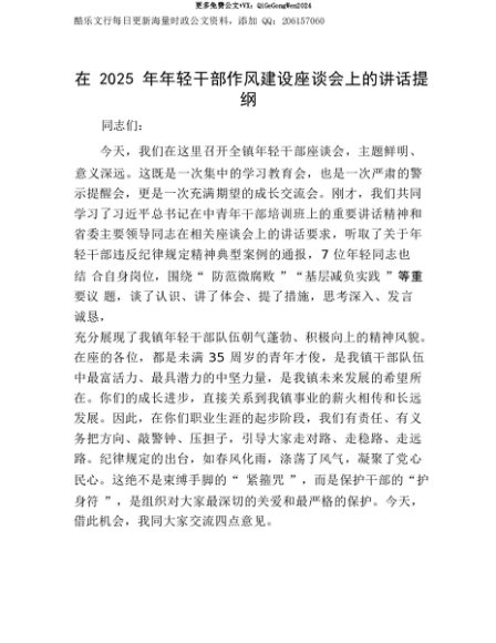 【七哥公文】2025年:【七哥公文】在2025年年轻干部作风建设座谈会上的讲话提纲+更多免费公文+VX:QiGeGongWen2024+更多免费公文+VX:QiGeGongWen2024