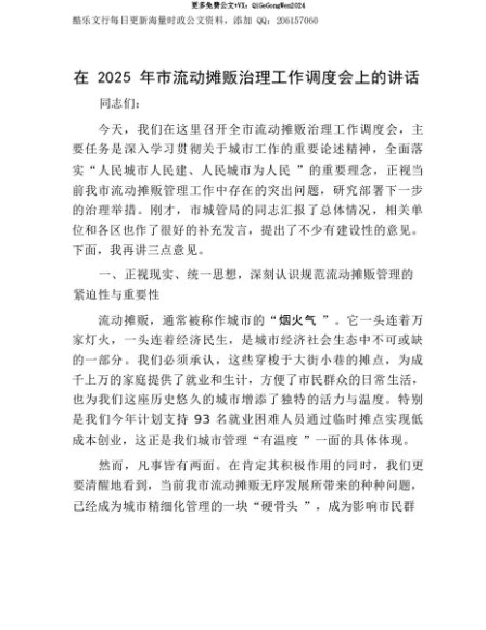 【七哥公文】2025年:【七哥公文】在2025年市流动摊贩治理工作调度会上的讲话+更多免费公文+VX:QiGeGongWen2024+更多免费公文+VX:QiGeGongWen2024