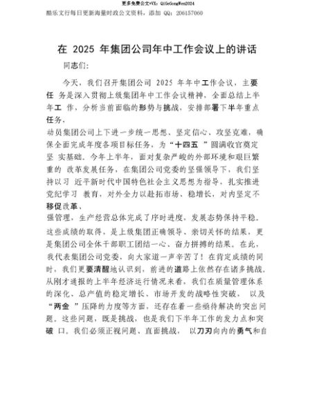 【七哥公文】2025年:【七哥公文】在2025年集团公司年中工作会议上的讲话+更多免费公文+VX:QiGeGongWen2024+更多免费公文+VX:QiGeGongWen2024