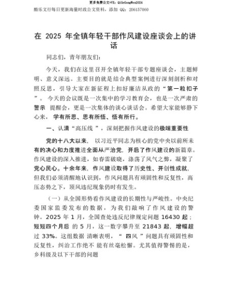 【七哥公文】2025年:【七哥公文】在2025年全镇年轻干部作风建设座谈会上的讲话+更多免费公文+VX:QiGeGongWen2024+更多免费公文+VX:QiGeGongWen2024