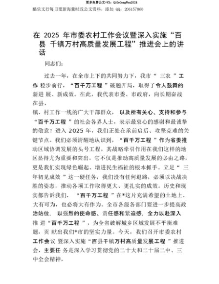 【七哥公文】2025年:【七哥公文】在2025年市委农村工作会议暨深入实施“百县千镇万村高质量发展工程”推进会上的讲话+更多免费公文+VX:QiGeGongWen2024+更多免费公文+VX:QiGeGongWen2024
