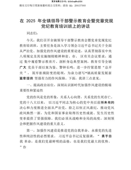 【七哥公文】2025年:【七哥公文】在2025年全镇领导干部警示教育会暨X章X规X纪教育培训班上的讲话+更多免费公文+VX:QiGeGongWen2024+更多免费公文+VX:QiGeGongWen2024