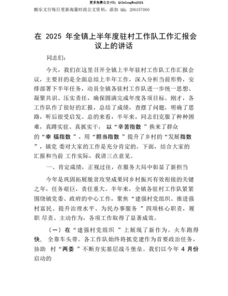 【七哥公文】2025年:【七哥公文】在2025年全镇上半年度驻村工作队工作汇报会议上的讲话+更多免费公文+VX:QiGeGongWen2024+更多免费公文+VX:QiGeGongWen2024