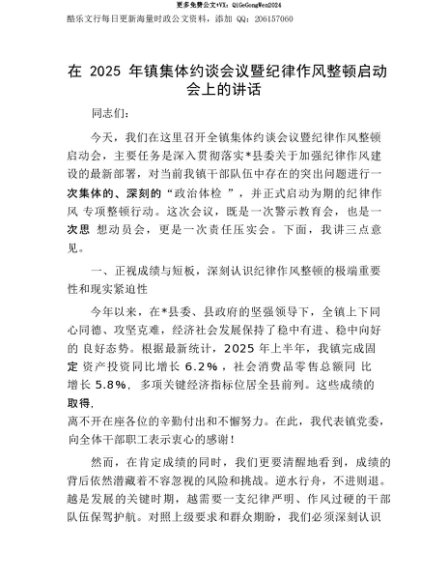 【七哥公文】2025年:【七哥公文】在2025年镇集体约谈会议暨纪律作风整顿启动会上的讲话+更多免费公文+VX:QiGeGongWen2024+更多免费公文+VX:QiGeGongWen2024