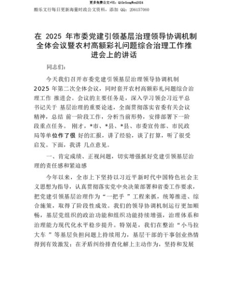 【七哥公文】2025年:【七哥公文】在2025年市委X建引领基层治理领导协调机制全体会议暨农村高额彩礼问题综合治理工作推进会上的讲话+更多免费公文+VX:QiGeGongWen2024+更多免费公文+VX:QiGeGongWen2024