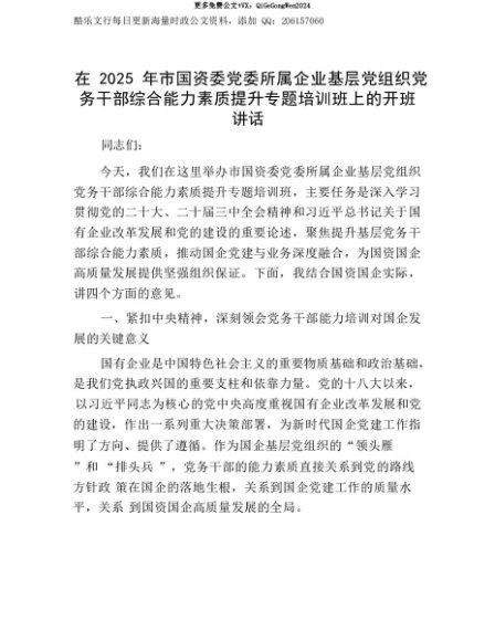 【七哥公文】2025年:【七哥公文】在2025年市国资委X委所属企业基层X组织X务干部综合能力素质提升专题培训班上的开班讲话+更多免费公文+VX:QiGeGongWen2024+更多免费公文+VX:QiGeGongWen2024