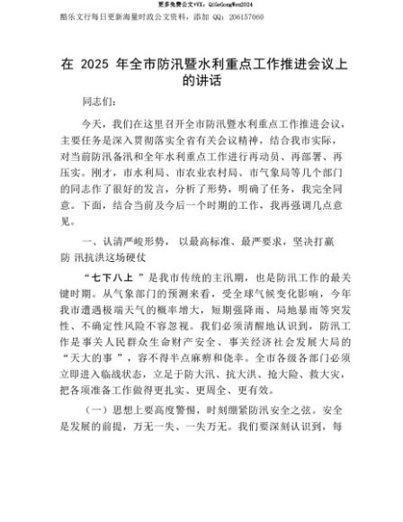 【七哥公文】2025年:【七哥公文】在2025年全市防汛暨水利重点工作推进会议上的讲话+更多免费公文+VX:QiGeGongWen2024+更多免费公文+VX:QiGeGongWen2024