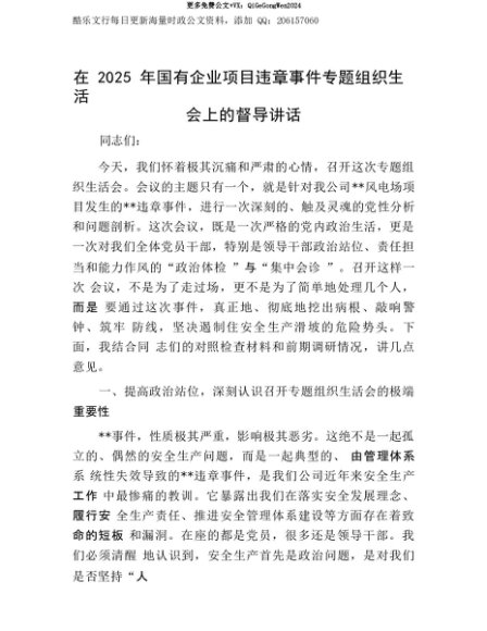 【七哥公文】2025年:【七哥公文】在2025年国有企业项目违章事件专题组织生活会上的督导讲话+更多免费公文+VX:QiGeGongWen2024+更多免费公文+VX:QiGeGongWen2024