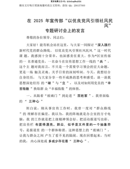 【七哥公文】2025年:【七哥公文】在2025年宣传部“以优良X风引领社风民风”专题研讨会上的发言+更多免费公文+VX:QiGeGongWen2024+更多免费公文+VX:QiGeGongWen2024