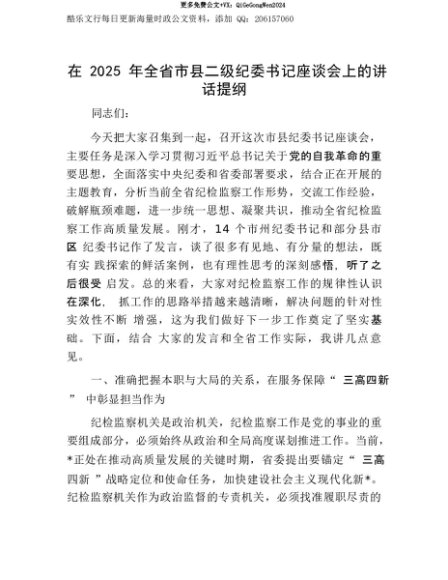 【七哥公文】2025年:【七哥公文】在2025年全省市县二级纪委书记座谈会上的讲话提纲+更多免费公文+VX:QiGeGongWen2024+更多免费公文+VX:QiGeGongWen2024