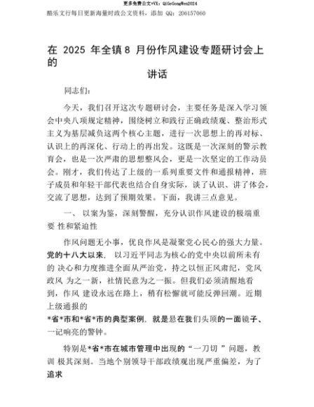 【七哥公文】2025年:【七哥公文】在2025年全镇8月份作风建设专题研讨会上的讲话+更多免费公文+VX:QiGeGongWen2024+更多免费公文+VX:QiGeGongWen2024