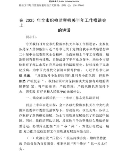 【七哥公文】2025年:【七哥公文】在2025年全市纪检监察机关半年工作推进会上的讲话+更多免费公文+VX:QiGeGongWen2024+更多免费公文+VX:QiGeGongWen2024