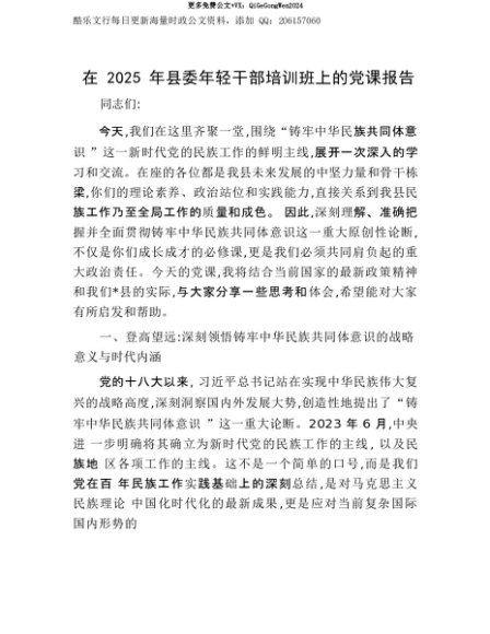 【七哥公文】2025年:【七哥公文】在2025年县委年轻干部培训班上的X课报告+更多免费公文+VX:QiGeGongWen2024+更多免费公文+VX:QiGeGongWen2024