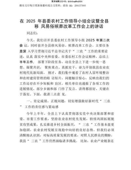 【七哥公文】2025年:【七哥公文】在2025年县委农村工作领导小组会议暨全县移风易俗殡葬改革工作会上的讲话+更多免费公文+VX:QiGeGongWen2024+更多免费公文+VX:QiGeGongWen2024