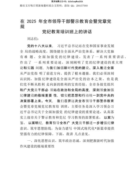 【七哥公文】2025年:【七哥公文】在2025年全市领导干部警示教育会暨X章X规X纪教育培训班上的讲话+更多免费公文+VX:QiGeGongWen2024+更多免费公文+VX:QiGeGongWen2024