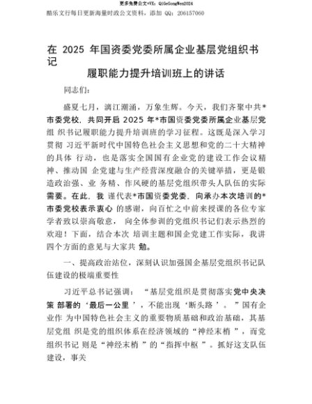 【七哥公文】2025年:【七哥公文】在2025年国资委X委所属企业基层X组织书记履职能力提升培训班上的讲话+更多免费公文+VX:QiGeGongWen2024+更多免费公文+VX:QiGeGongWen2024