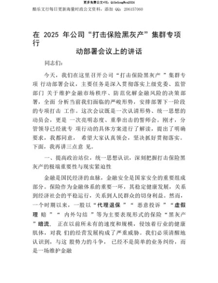 【七哥公文】2025年:【七哥公文】在2025年公司“打击保险黑灰产”集群专项行动部署会议上的讲话+更多免费公文+VX:QiGeGongWen2024+更多免费公文+VX:QiGeGongWen2024