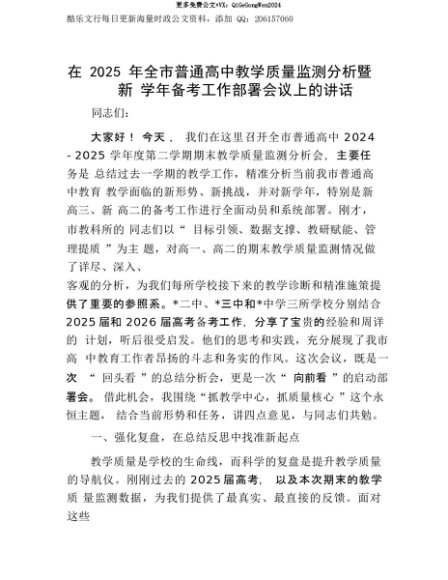 【七哥公文】2025年:【七哥公文】在2025年全市普通高中教学质量监测分析暨新学年备考工作部署会议上的讲话+更多免费公文+VX:QiGeGongWen2024+更多免费公文+VX:QiGeGongWen2024
