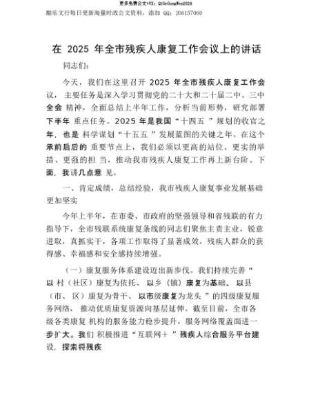【七哥公文】2025年:【七哥公文】在2025年全市残疾人康复工作会议上的讲话+更多免费公文+VX:QiGeGongWen2024+更多免费公文+VX:QiGeGongWen2024