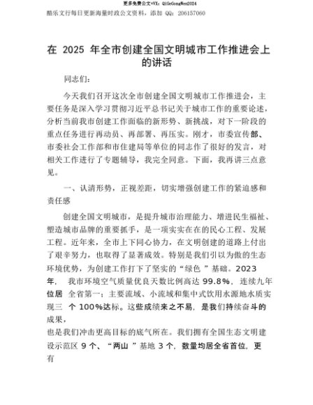 【七哥公文】2025年:【七哥公文】在2025年全市创建全国文明城市工作推进会上的讲话+更多免费公文+VX:QiGeGongWen2024+更多免费公文+VX:QiGeGongWen2024