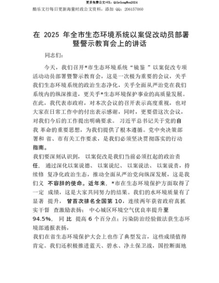 【七哥公文】2025年:【七哥公文】在2025年全市生态环境系统以案促改动员部署暨警示教育会上的讲话+更多免费公文+VX:QiGeGongWen2024+更多免费公文+VX:QiGeGongWen2024