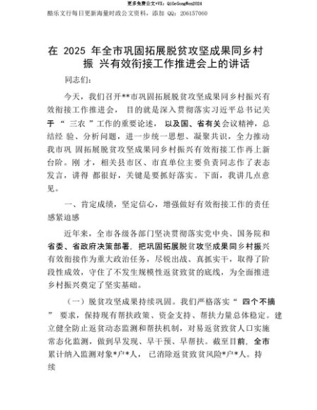 【七哥公文】2025年:【七哥公文】在2025年全市巩固拓展脱贫攻坚成果同乡村振兴有效衔接工作推进会上的讲话+更多免费公文+VX:QiGeGongWen2024+更多免费公文+VX:QiGeGongWen2024