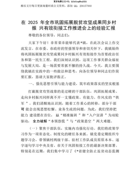 【七哥公文】2025年:【七哥公文】在2025年全市巩固拓展脱贫攻坚成果同乡村振兴有效衔接工作推进会上的经验汇报+更多免费公文+VX:QiGeGongWen2024+更多免费公文+VX:QiGeGongWen2024