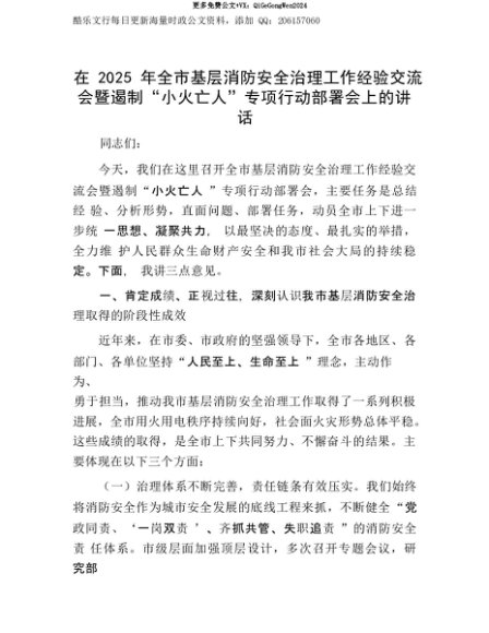【七哥公文】2025年:【七哥公文】在2025年全市基层消防安全治理工作经验交流会暨遏制“小火亡人”专项行动部署会上的讲话+更多免费公文+VX:QiGeGongWen2024+更多免费公文+VX:QiGeGongWen2024