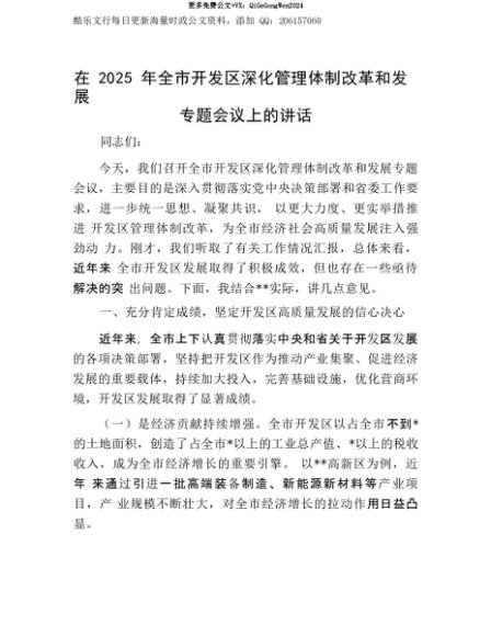 【七哥公文】2025年:【七哥公文】在2025年全市开发区深化管理体制改革和发展专题会议上的讲话+更多免费公文+VX:QiGeGongWen2024+更多免费公文+VX:QiGeGongWen2024